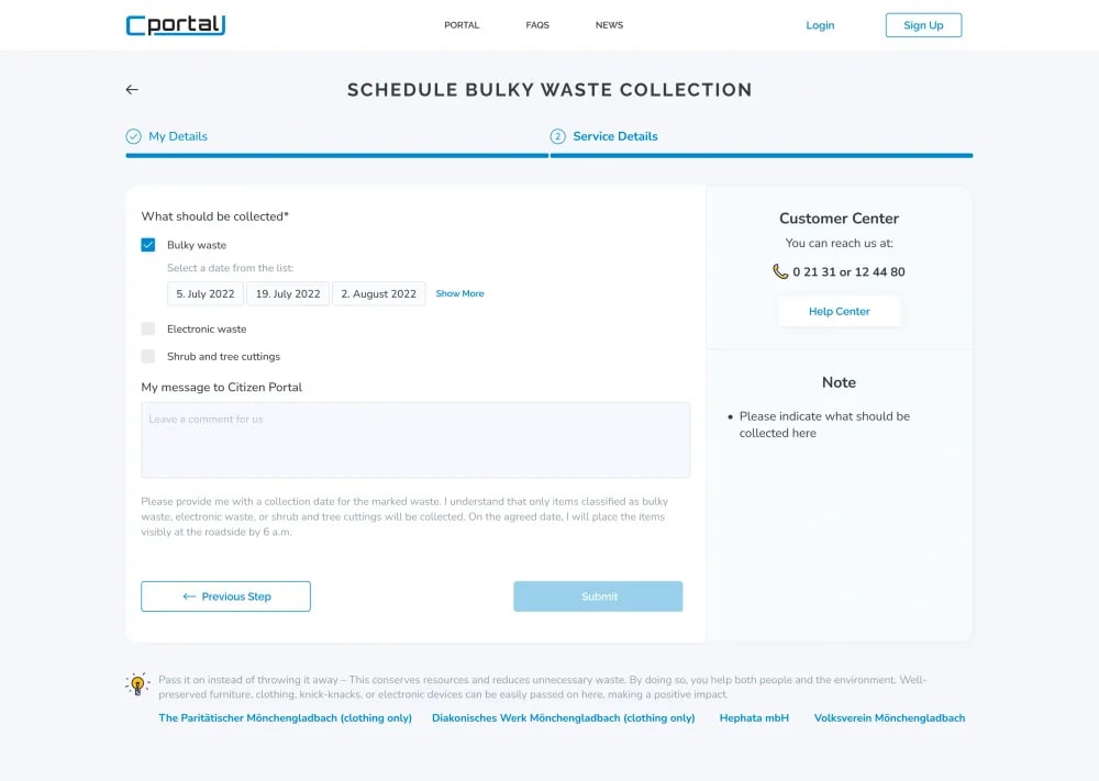 The platform centralises key city services — from waste and bulky-item collection to container requests, schedule changes, and appointments.